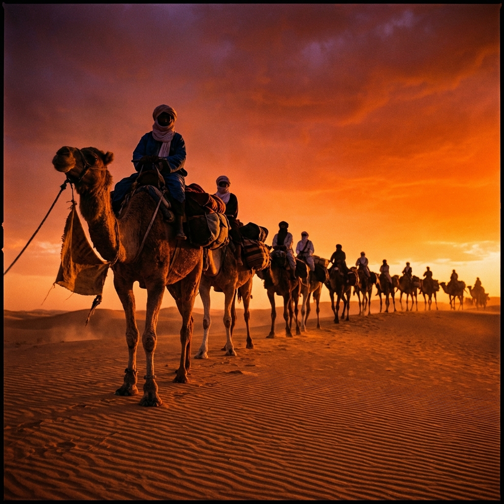 Merzouga is the doorway to the Erg Chebbi—a massive field of sand dunes reaching heights of up to 150 meters. The color of the sand changes from soft pink at sunrise to a deep, burning orange at noon. This is the Sahara you've imagined: a vast, silent ocean of sand where the only sound is the wind shifting the dunes. To stand atop an Erg Chebbi dune as the sun sets is to experience the true scale of North Africa.